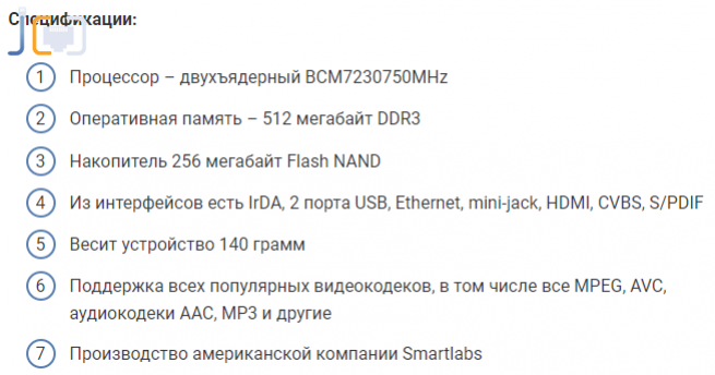SML-482, SmartlabsHD Base. Одна из самых стабильно работающих моделей. Славится долголетием службы и сложной начинкой. Обладает двухъядерным процессором, 512 Мбайт оперативной памяти, 256 Мбайт накопительной памяти, читает все форматы видео, имеет функцию 3D. Стоимость около 1700 рублей в салонах связи.