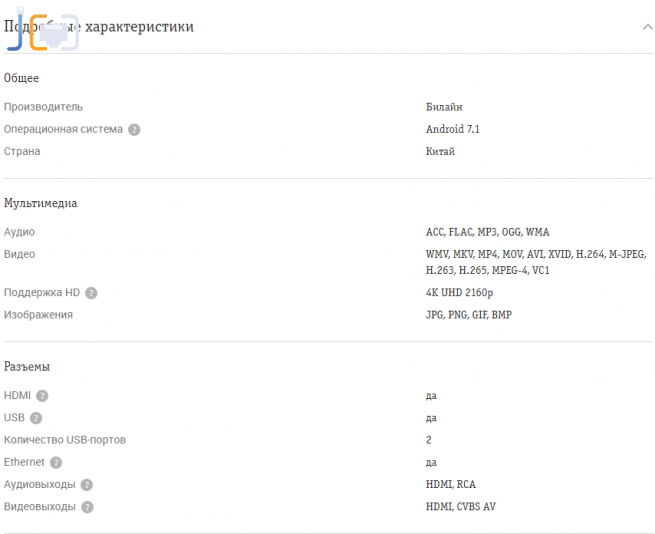 ТВ приставка Билайн ТВ. Поддерживает HD, все форматы видео. Работает на системе Андроид 7.1. Объем оперативной памяти 2 Гб. Имеет беспроводное соединение, работает с любым интернетом (не только Билайн). Умное управление эфиром. По отзывам из плюсов – легкая настройка ТВ приставки, из минусов – бывает, нужно ждать отклик при нажатии кнопок. При приобретении две недели бесплатного доступа к 70 телеканалам. Стоимость приставки в салонах Билайн 3300 рублей.